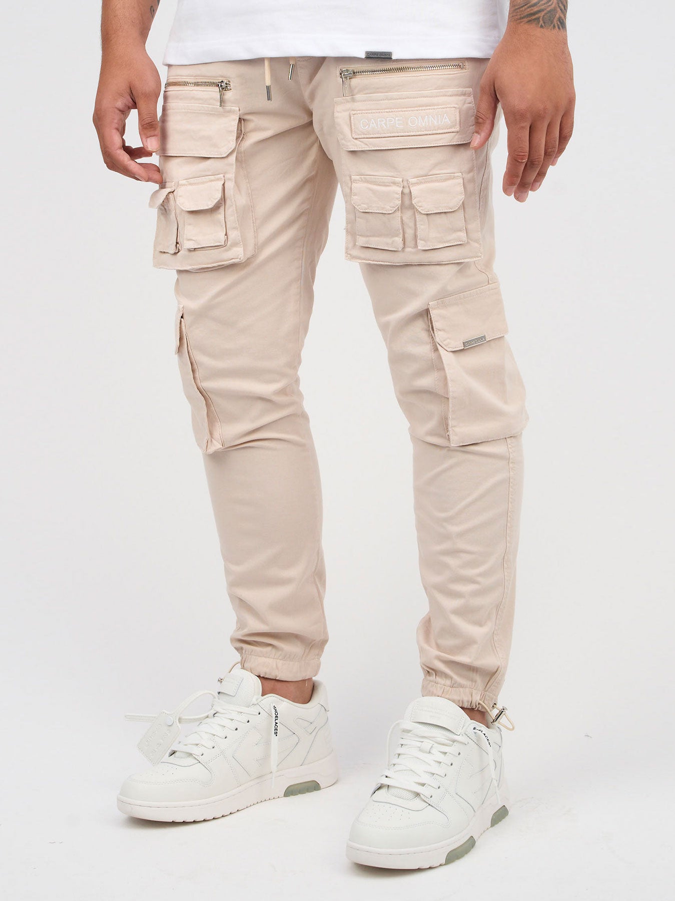 Beige Cargo Pants with front CARPE OMNIA Pocket.
