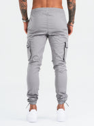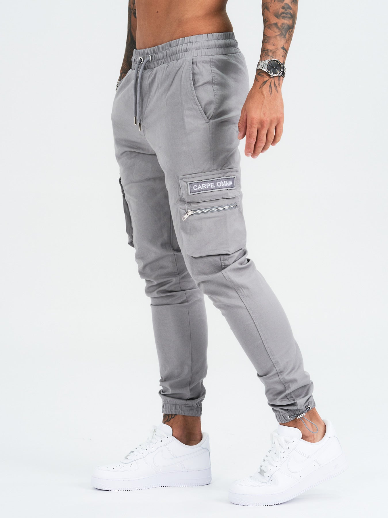 Light Grey Cargo Pants with CARPE OMNIA Pocket.